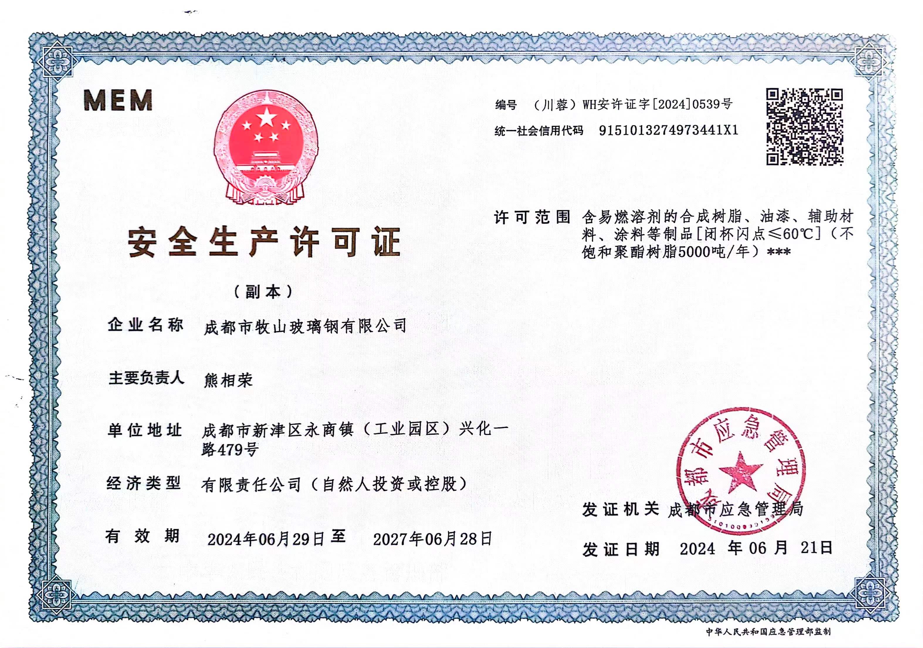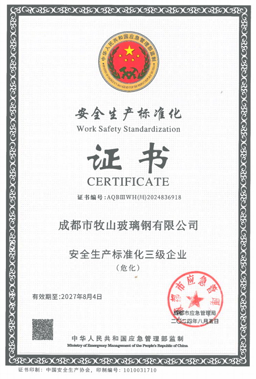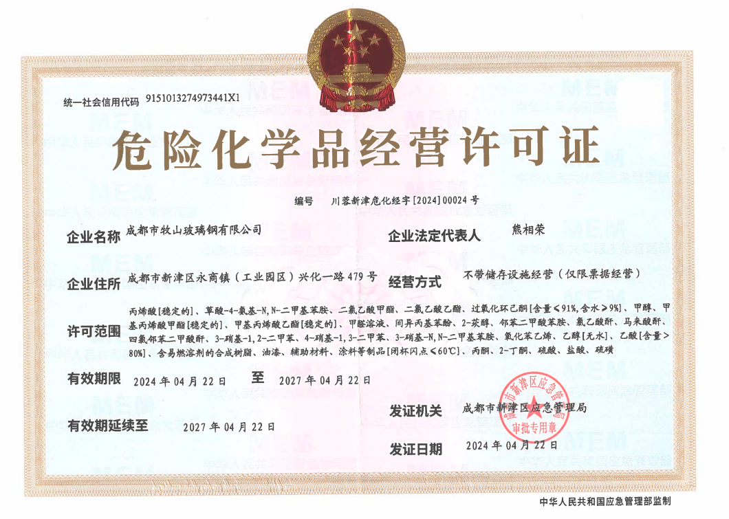 成都市牧山玻璃钢有限公司创始于1996年,公司主要经营废气、废水处理设备、玻璃钢管道及储罐,非标玻璃钢产品的生产、销售、现场安装调试,不饱和聚酯树脂生产、销售以及承接防腐施工工程的专业公司,是一家在四川、重庆及西南地区化工、建材行业有一定影响力的民营企业。公司位于成都市新津区工业园区B区内,(距离成都双流国际机场约20公里)占地面积85.43亩,建筑面积31.5亩。公司发展至今拥有职工110人,其中获得了中高级职称的专业技术人员13人。具有玻璃钢管道、储罐及其它玻璃钢制品约10000吨/年,不饱和聚酯树脂大约5000吨/年和辅料100吨/年的生产能力。 主要产品有玻璃纤维缠绕容器、玻璃钢盐酸储槽、玻璃钢槽子、玻璃钢运输罐、、、、